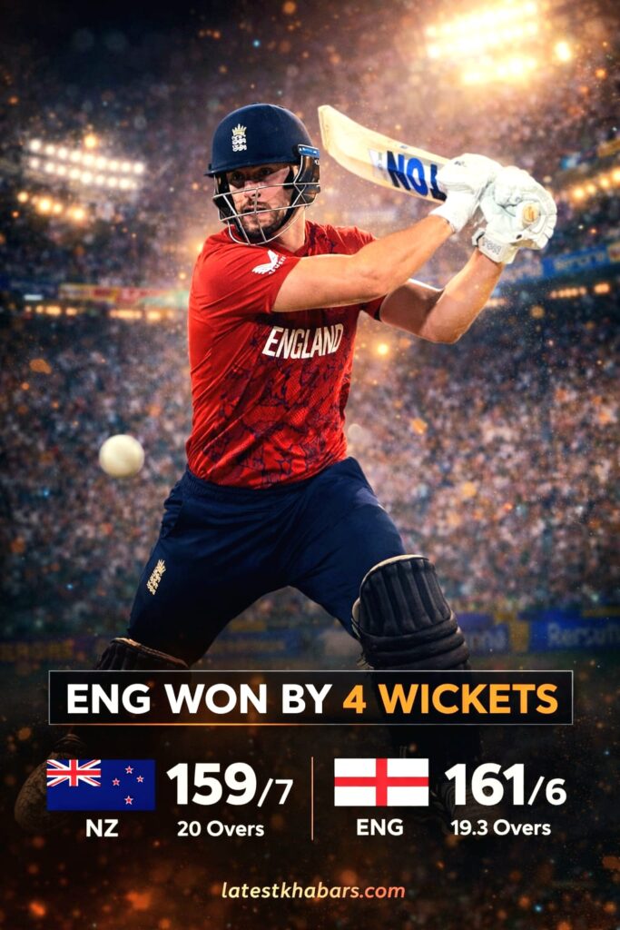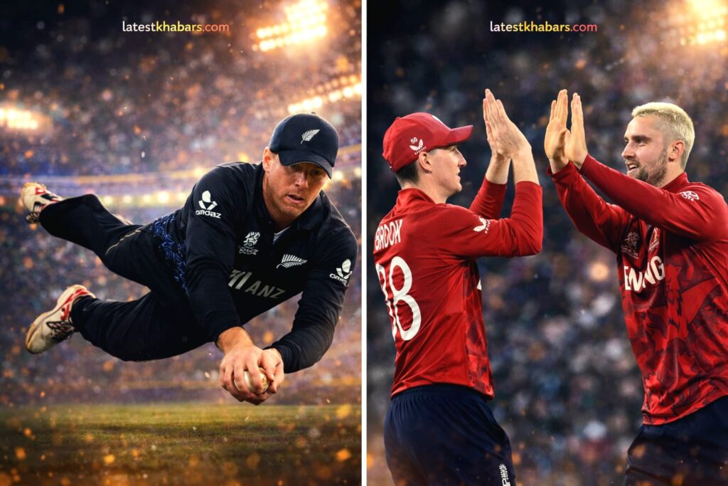 ENG vs NZ T20 World Cup 2026 मैच में इंग्लैंड ने न्यूजीलैंड को 4 विकेट से हराकर रोमांचक जीत दर्ज की। जानिए ग्लेन फिलिप्स, रचिन रवींद्र और इंग्लैंड के मिडिल ऑर्डर के प्रदर्शन सहित पूरा मैच विश्लेषण, टर्निंग पॉइंट और पॉइंट्स टेबल पर असर – latestkhabars.com पर।