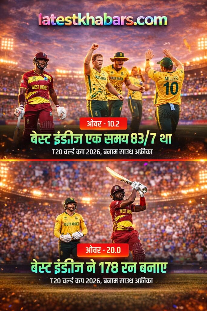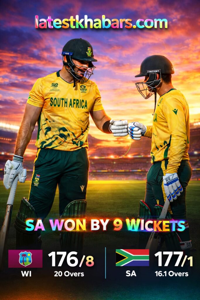 26 फरवरी को खेले गए ICC Men’s T20 World Cup 2026 के अहम मुकाबले में South Africa national cricket team ने शानदार प्रदर्शन करते हुए West Indies cricket team को 9 विकेट से हरा दिया। यह मुकाबला टूर्नामेंट के लिहाज से बेहद महत्वपूर्ण था और साउथ अफ्रीका ने इसे पूरी तरह अपने नियंत्रण में रखा।